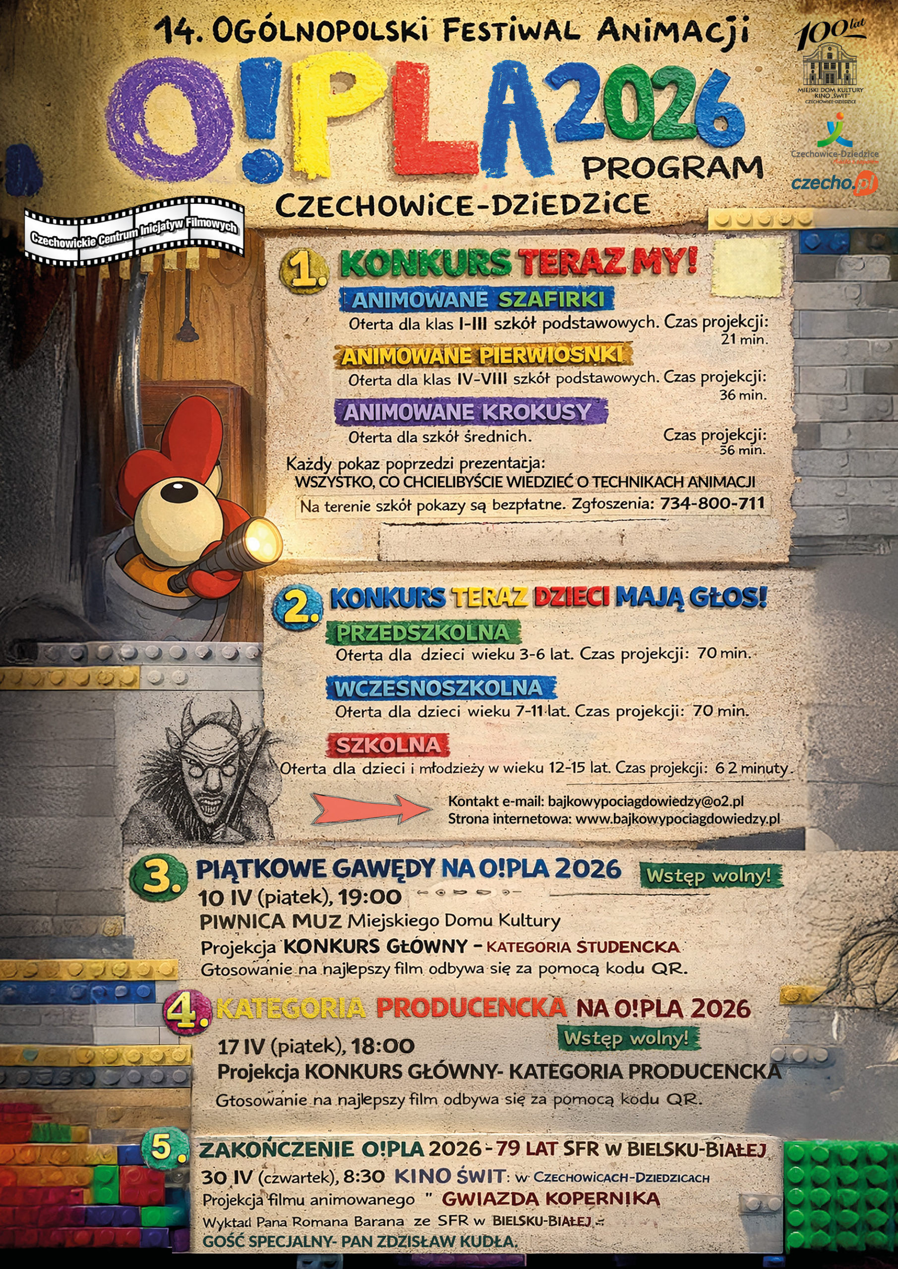 Czytaj więcej…Czechowickie Centrum Inicjatyw Filmowych oraz Miejski Dom Kultury – Kino Świt zapraszają na wydarzenia organizowane w ramach 14. Ogólnopolskiego Festiwalu Animacji O!PLA 2026. Tegoroczna edycja festiwalu odbędzie się w dniach od 21 marca do 30 kwietnia.