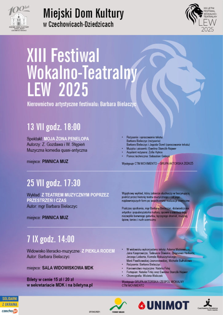 Z radością zapraszamy Państwa na XIII edycję Festiwalu Wokalno-Teatralnego LEW, który na stałe wpisał się w kulturalny kalendarz Czechowic-Dziedzic.