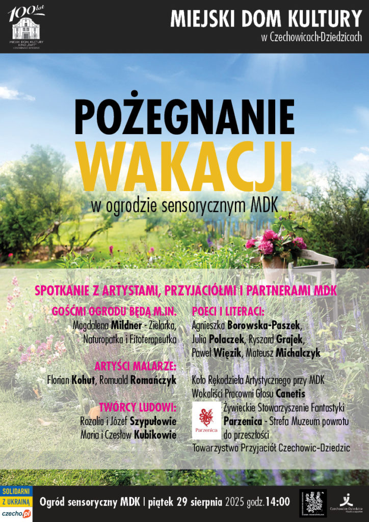 Serdecznie zachęcamy do wspólnego świętowania końca wakacji w wyjątkowej, pełnej barw i dźwięków przestrzeni Ogrodu Sensorycznego Miejskiego Domu Kultury. Będzie to popołudnie spotkań ze sztuką, naturą oraz ludźmi, którzy od lat tworzą i wspierają życie kulturalne naszego regionu.