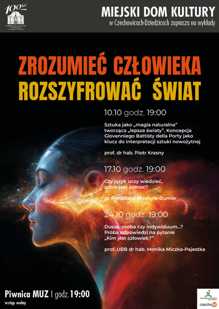 Jesienny cykl spotkań w MDK Czechowice-Dziedzice to zaproszenie do wspólnej refleksji nad naturą człowieka, języka i sztuki – trzema wymiarami, które od wieków pozwalają nam interpretować świat i siebie samych.