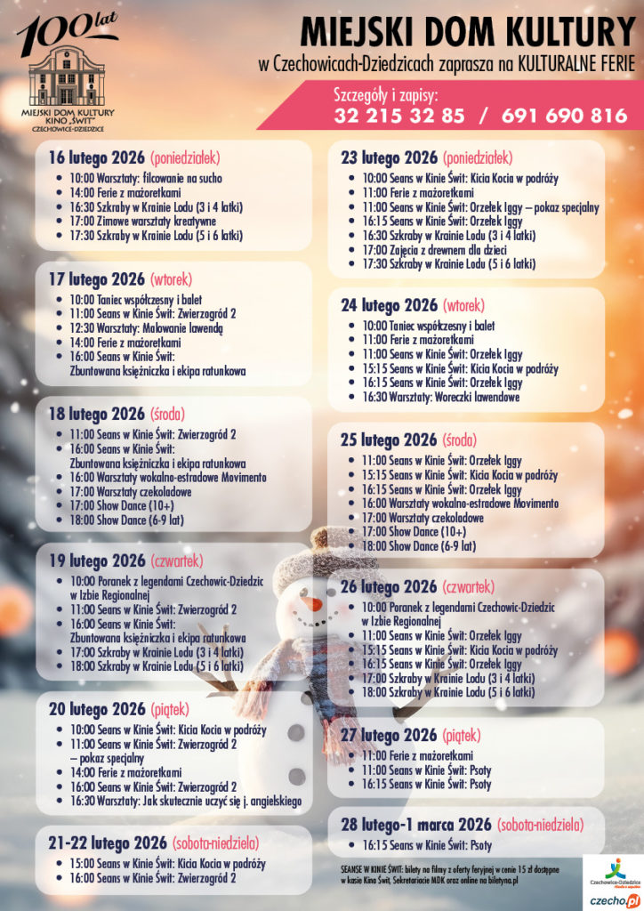 Zima w mieście nie musi oznaczać nudy. Miejski Dom Kultury w Czechowicach-Dziedzicach zaprasza na „Kulturalne Ferie” – dwa tygodnie wypełnione filmowymi hitami, artystycznymi wyzwaniami i dawką pozytywnej energii. Na ten czas przygotowaliśmy ciekawą ofertę, w której każdy młody odkrywca znajdzie coś dla siebie.