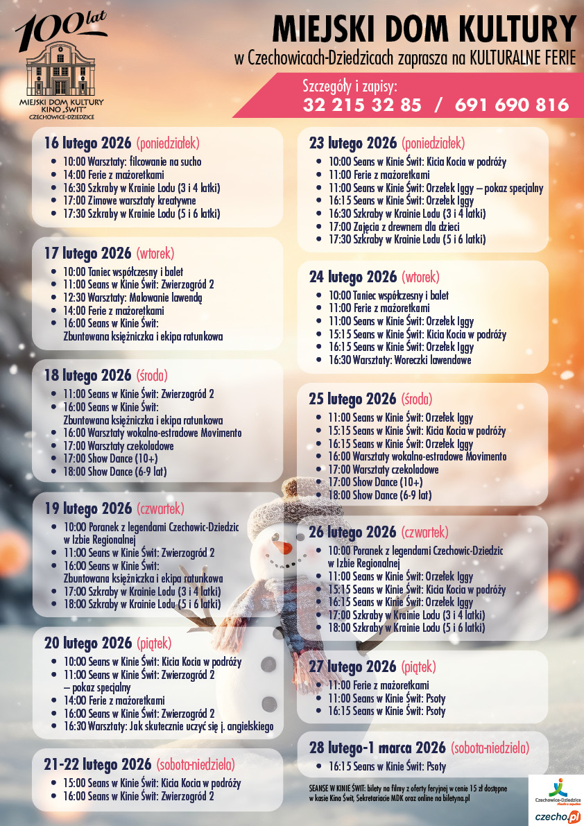 Zima w mieście nie musi oznaczać nudy. Miejski Dom Kultury w Czechowicach-Dziedzicach zaprasza na „Kulturalne Ferie” – dwa tygodnie wypełnione filmowymi hitami, artystycznymi wyzwaniami i dawką pozytywnej energii. Na ten czas przygotowaliśmy ciekawą ofertę, w której każdy młody odkrywca znajdzie coś dla siebie.